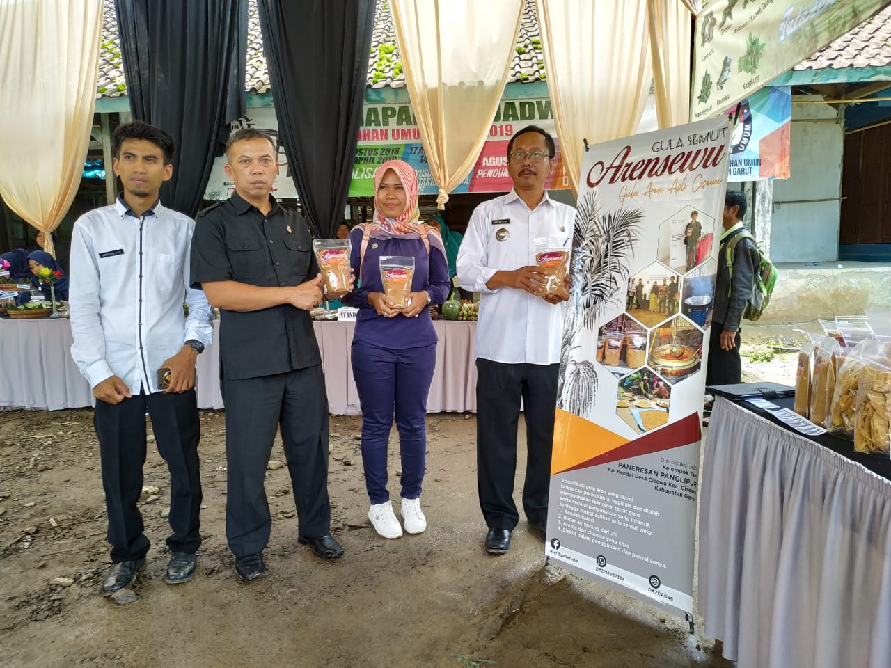 Ketua Komisi A DPRD Garut, H Alit Suherman (baju hitam) bersama Camat Cisewu Doni Rukmana (baju putih paling kanan) tengah memperlihatkan produk unggulan Desa Cisewu, gula semut, bersama dua pendamping desa. (Foto: Latif Rochyana/Gosip Garut)
