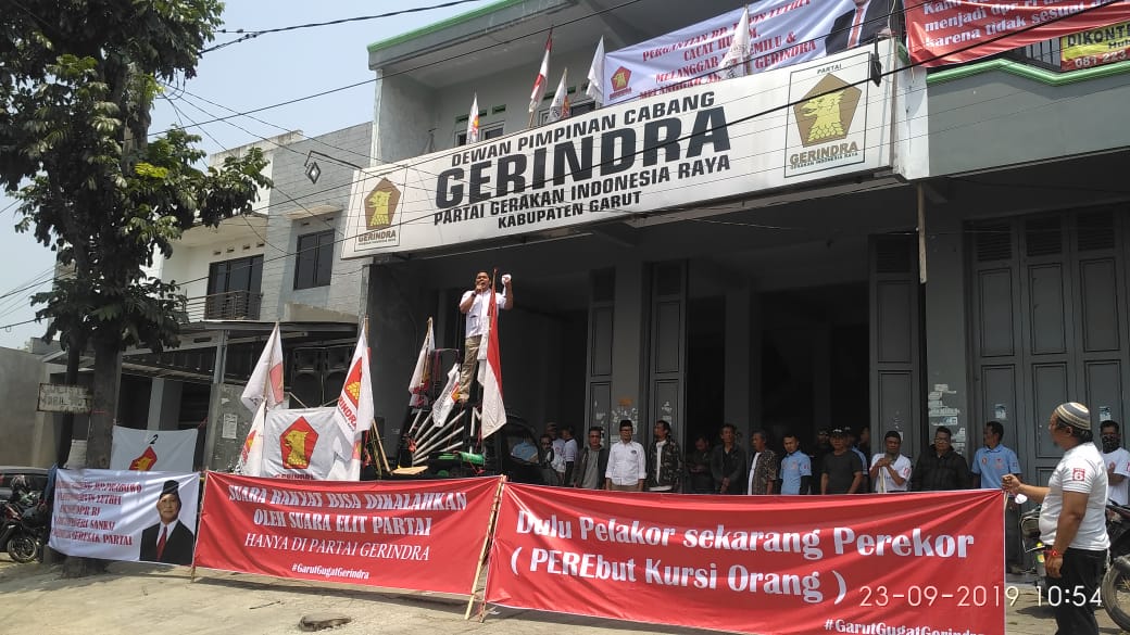 GOSIPGARUT.ID — Gegara Ervin Luthfi, calon anggota DPR RI terpilih diganti oleh caleg lainnya Mulan Jameela, sejumlah relawan kader Partai Gerindra itu serta elemen masyarakat Garut mengepung Kantor DPC Gerindra Jalan Proklamasi Garut, Senin (23/9/2019). Mereka menggelar aksi demonstrasi terkait penggantian caleg terpilih tersebut.