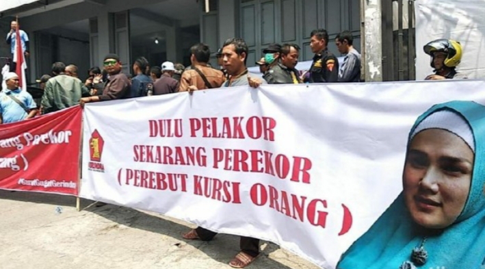 Foto Mulan Jameela dalam spanduk bertuliskan “Dulu Pelakor Sekarang Perekor”. (Foto: Istimewa)
