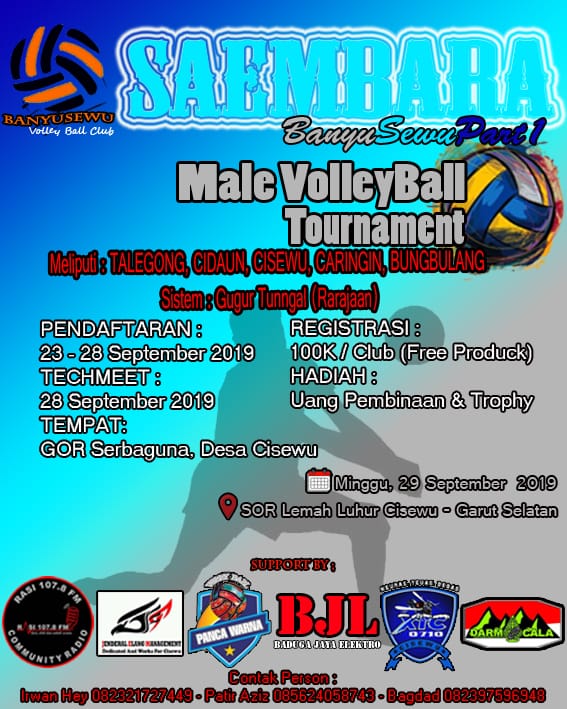 GOSIPGARUT.ID — Sebanyak 24 klub vollybal dari lima kecamatan di dua kabupaten akan bertanding dalam turnamen vollybal yang bertajuk “Male Volleybal Tounament”, pada Minggu 29 September 2019. Pertandingan tersebut digelar di stadion olah raga (SOR) Lemah Luhur Kecamatan Cisewu, Kabupaten Garut.