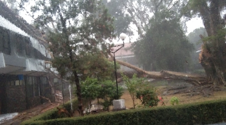 “Ada suara gemuruh dan ada benturan keras. Saat dilihat ternyata pohon beringin yang usianya sudah puluhan tahun tumbang akibat hujan yang disertai angin kencang,” ujar salah seorang pegawai honorer, Yogi Budiman, Selasa (13/11/2019).