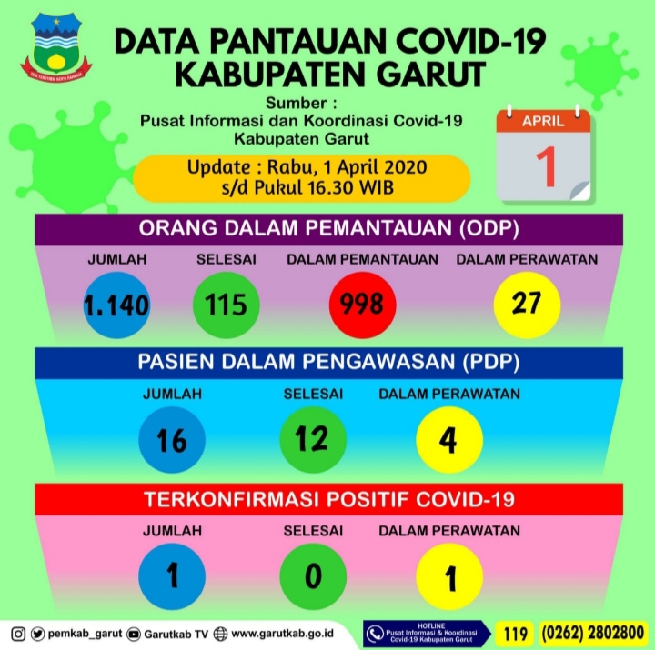 “Sekarang tinggal empat orang PDP yang dirawat di RSU,” kata Juru Bicara Pusat Informasi dan Koordinasi Covid-19 Kabupaten Garut, Ricky Rizky Darajat melalui siaran pers, Rabu (1/4/2020).