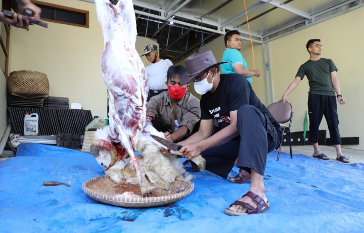 Wabup Garut Ikut Mengiris Daging Hewan Kurban yang Baru Disembelihnya