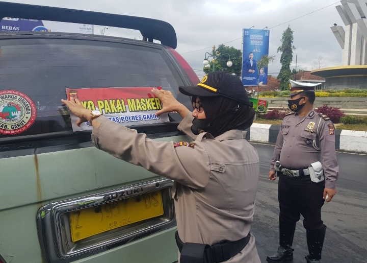 GOSIPGARUT.ID — Dalam rangka meningkatkan kesadaran masyarakat dalam penggunaan masker, jajaran Satuan Lalu Lintas Polres Garut, Minggu (28/9/2020) menggelar kegiatan pemasangan stiker “Ayo Pakai Masker” pada kendaraan roda empat yang sedang melintas di jalanan.