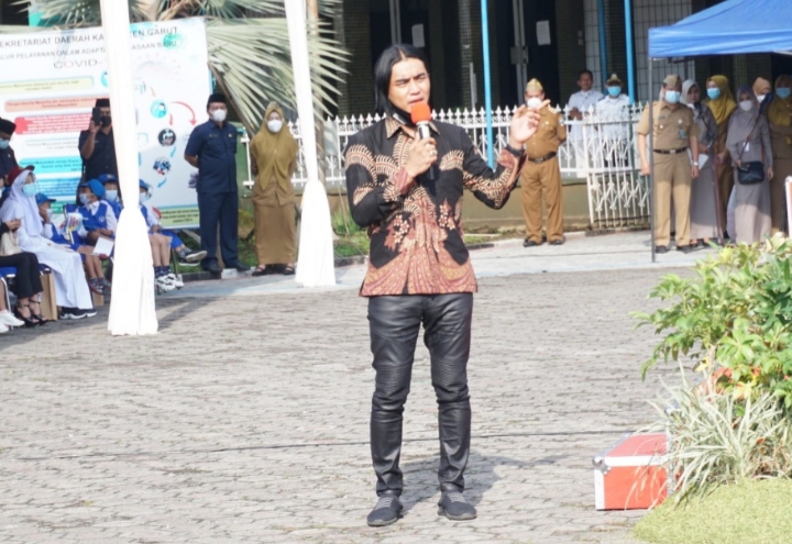 GOSIPGARUT.ID — Penyanyi kenamaan Charly Van Houten yang menjadi Duta Pendidikan Jawa Barat, menghadiri pencanangan Gerakan Ayo Masuk Sekolah di Lapangan Setda Jalan Pembangunan Kabupaten Garut, Senin (21/3/2021).