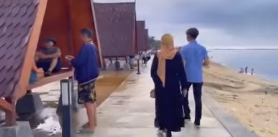 Terlihat pula fasilitas pendukung berupa deretan gazebo lengkap dengan area pedestrian di pinggir pantai yang langsung menghadap ke lautan sehingga bisa makin memanjakan pengunjung.