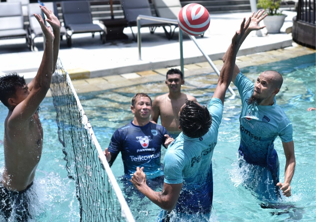 Fun game seperti polo air dilakukan pemain di kolam renang hotel. Sementara sisanya menjalani latihan di tempat kebugaran. Sesi latihan kali ini pun hanya berlangsung satu jam.