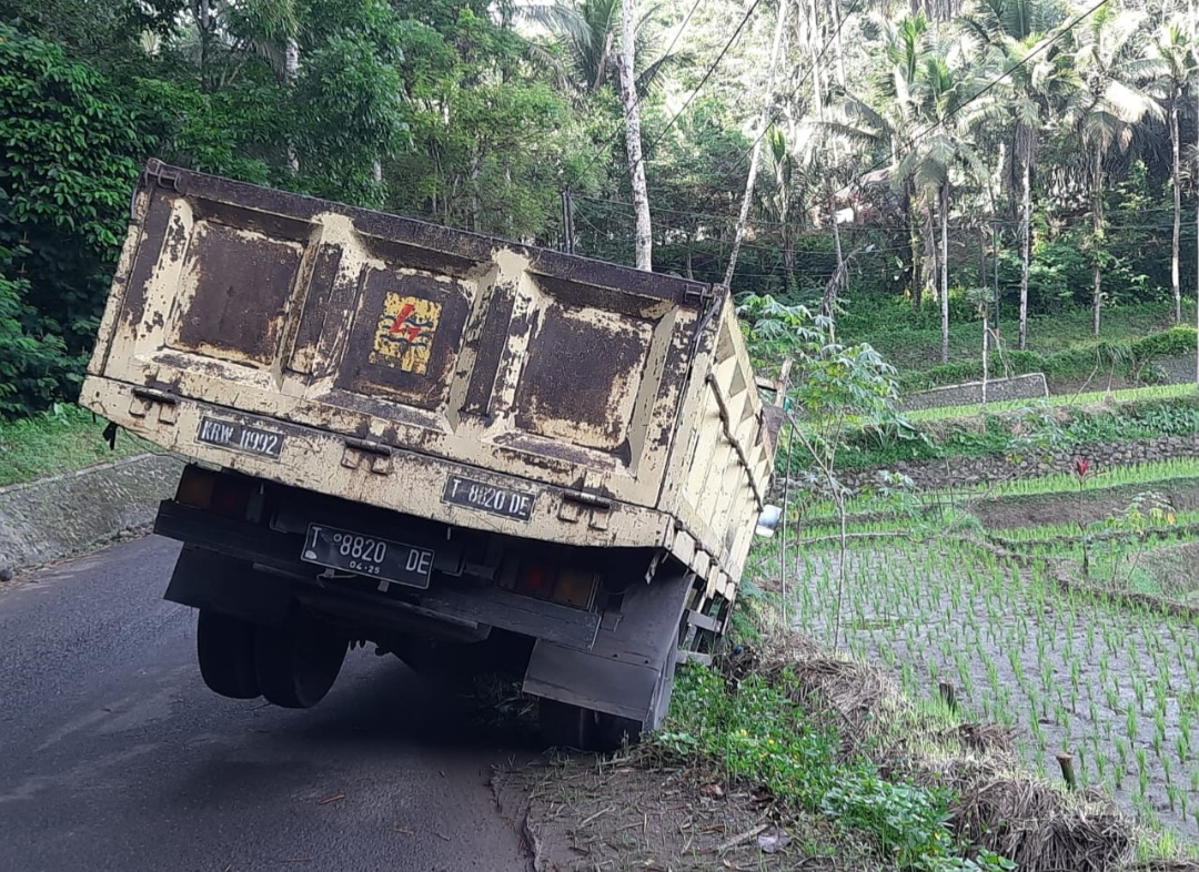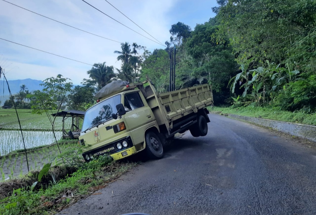 Sebuah mobil truk Nopol T 8820 DE, ditemukan terperosok di jalan raya Pangalengan -- Cisewu, pada Kamis (7/4/2022) pagi. Sebagian badannya, yakni bagian kepalanya tampak keluar jalur dan mencium parit yang berada di bawah jalan. Sementara bagian ekornya masih berada di jalan raya dengan posisi ban belakang sebelah kiri terangat.