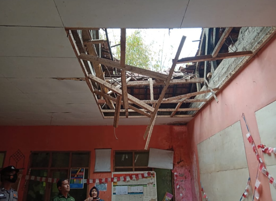 Bangunan sekolah yang ambruk di SDN 1 Bunisari Kecamatan Malangbong terjadi Selasa (4/10/2022) saat kegiatan belajar mengajar berlangsung. Peristiwa itu menyebabkan empat siswa tertimpa material bangunan atap kelas sehingga harus dibawa ke Puskesmas untuk mendapatkan penanganan medis. (Ant)