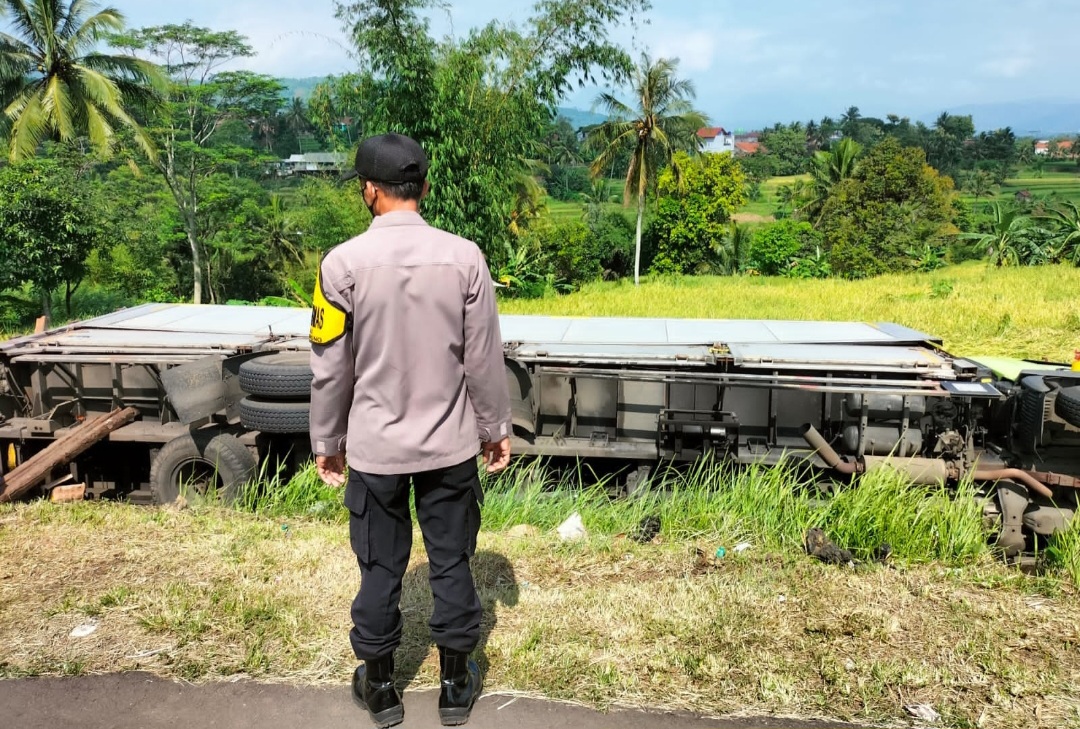Saat itu truk fuso Nopol B 9664 TEY yang dikemudikan Asep Deni Sepriana (30) warga Kecamatan Rancakalong, Kabupaten Sumedang, meluncur dari arah Limbangan menuju Malangbong. Ketika sampai di lokasi kejadian dalam kondisi jalan agak menanjak, tiba-tiba mobil oleng dan terguling ke parit.