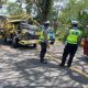 Petugas polisi sedang olah TKP di Jalan Raya Limbangan, Kabupaten Garut, yang merupakan lokasi adu banteng dua truk besar, Kamis (4/4/2024).