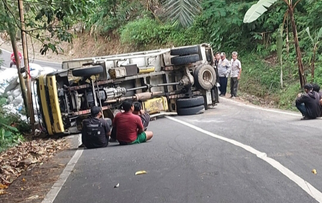 Truk bermuatan pupuk terbalik di Tanjakan Cisarua, Kecamatan Cisewu, Kabupaten Garut, Selasa (16/7/2024). (Foto: Galih Pawarti)