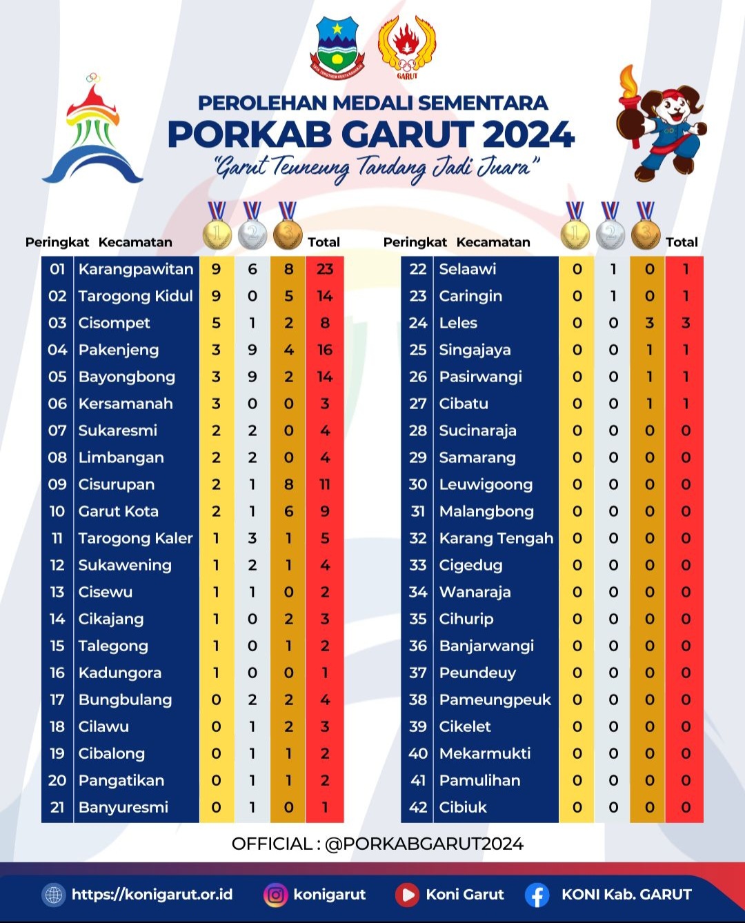 GOSIPGARUT.ID — Kontingen Kecamatan Karangpawitan memuncaki perolehan medali terbanyak pada klasemen sementara hari kedua Pekan Olahraga Kabupaten (Porkab) Garut 2024, Selasa (23/7/2024). Kecamatan ini mendulang 23 medali (9 emas, 6 perak dan 8 perunggu).