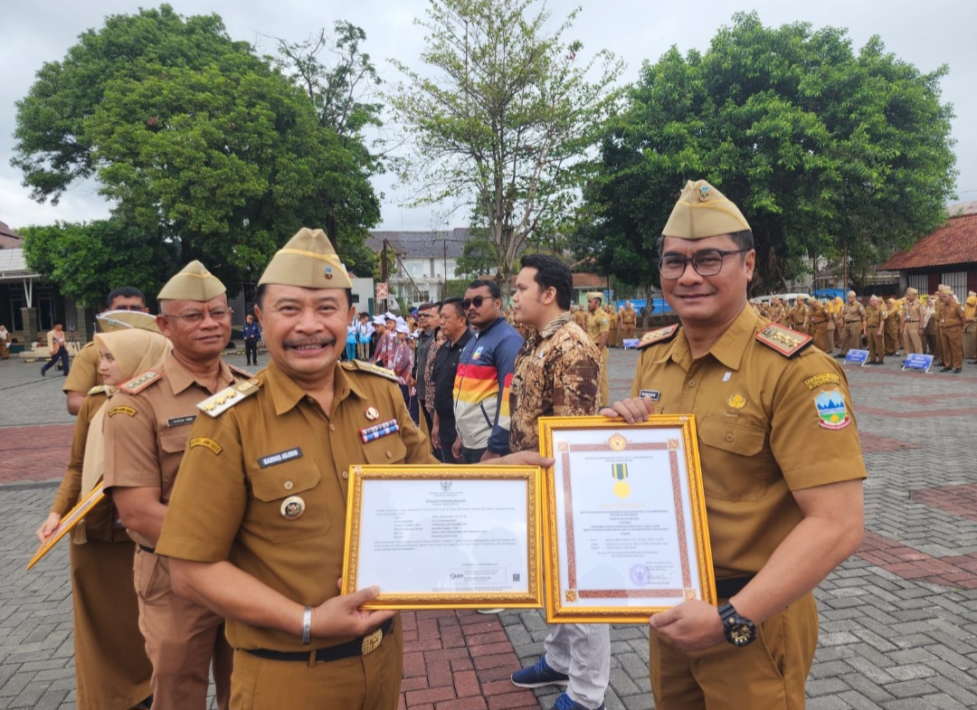 Penghargaan diserahkan oleh Penjabat (Pj) Bupati Garut, Barnas Adjidin, dalam apel gabungan di Lapang Sekretariat Daerah (Setda) Kabupaten Garut, Jalan Pembangunan, Kecamatan Tarogong Kidul, Senin (9/9/2024).