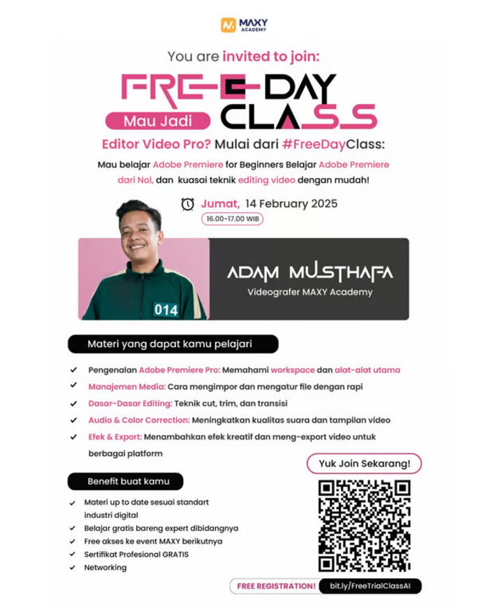 Jakarta, GOSIPGARUT.ID – MAXY Academy kembali menunjukkan komitmennya dalam memberdayakan talenta digital dengan menyelenggarakan Free Day Class yang kali ini berfokus pada Adobe Premiere untuk Pemula. Sesi ini akan dipandu oleh Adam Mustafa, seorang editor video profesional, dan akan berlangsung pada Jumat, 14 Februari 2025. Inisiatif ini merupakan bagian dari upaya MAXY Academy dalam memberikan kesempatan belajar yang mudah diakses bagi para calon kreator konten.