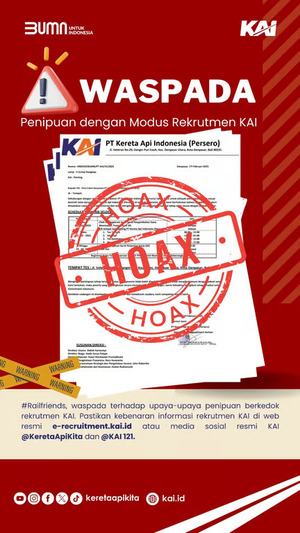 “Semua informasi rekrutmen KAI sepenuhnya menggunakan website resmi dengan alamat e-recruitment.kai.id dan media sosial resmi perusahaan @keretaapikita atau @kai121. Jika menemukan info rekrutmen yang tidak bersumber dari situs tersebut, agar masyarakat dapat mengabaikannya,” jelas Anne.