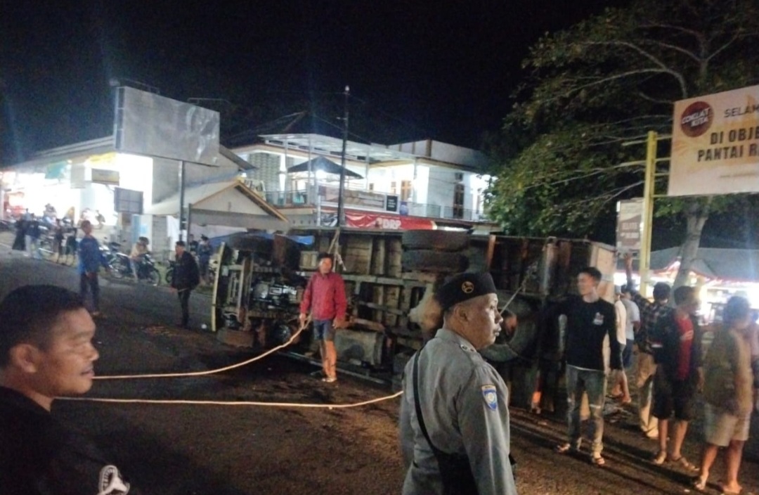 Truk muatan kayu batangan terguling di kawasan perempatan pintu masuk Objek Wisata Rancabuaya, Jalan Lintas Selatan, Desa Purbayani, Kecamatan Caringin, Kabupaten Garut, Senin malam (28/07/2025).