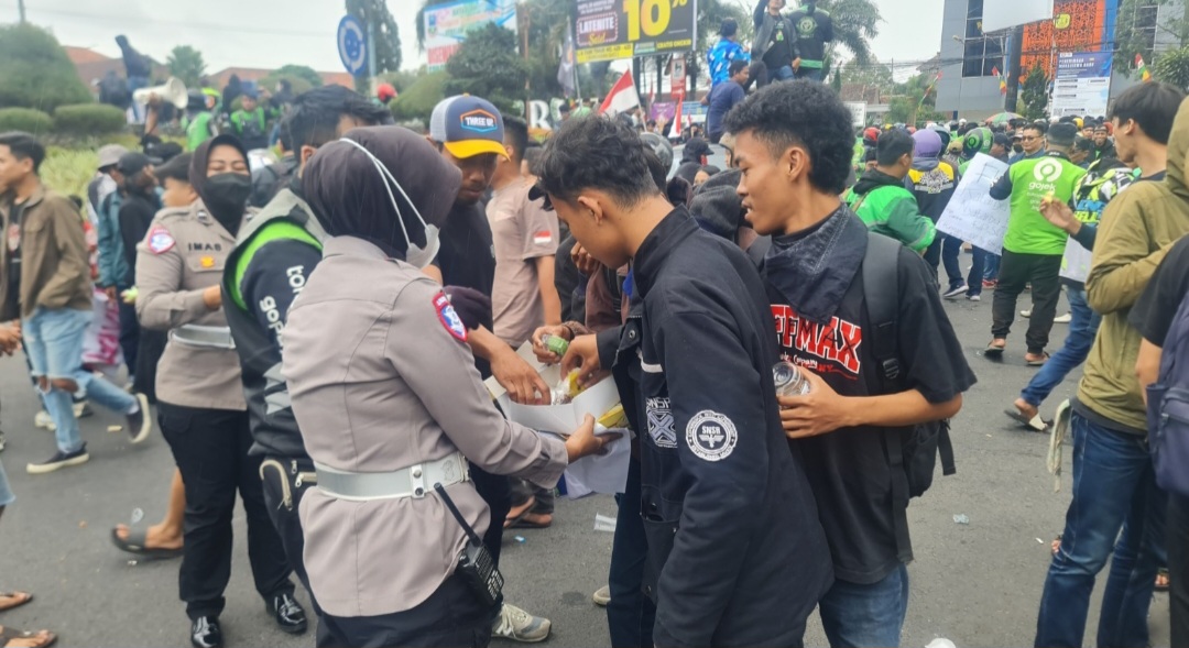 Namun, ada pemandangan yang mencuri perhatian. Di tengah kerumunan dan panas terik siang hari, aparat Polres Garut yang diturunkan untuk mengamankan jalannya aksi justru tampil dengan pendekatan tak biasa: mereka membagikan air mineral, kue, hingga permen kepada peserta unjuk rasa.