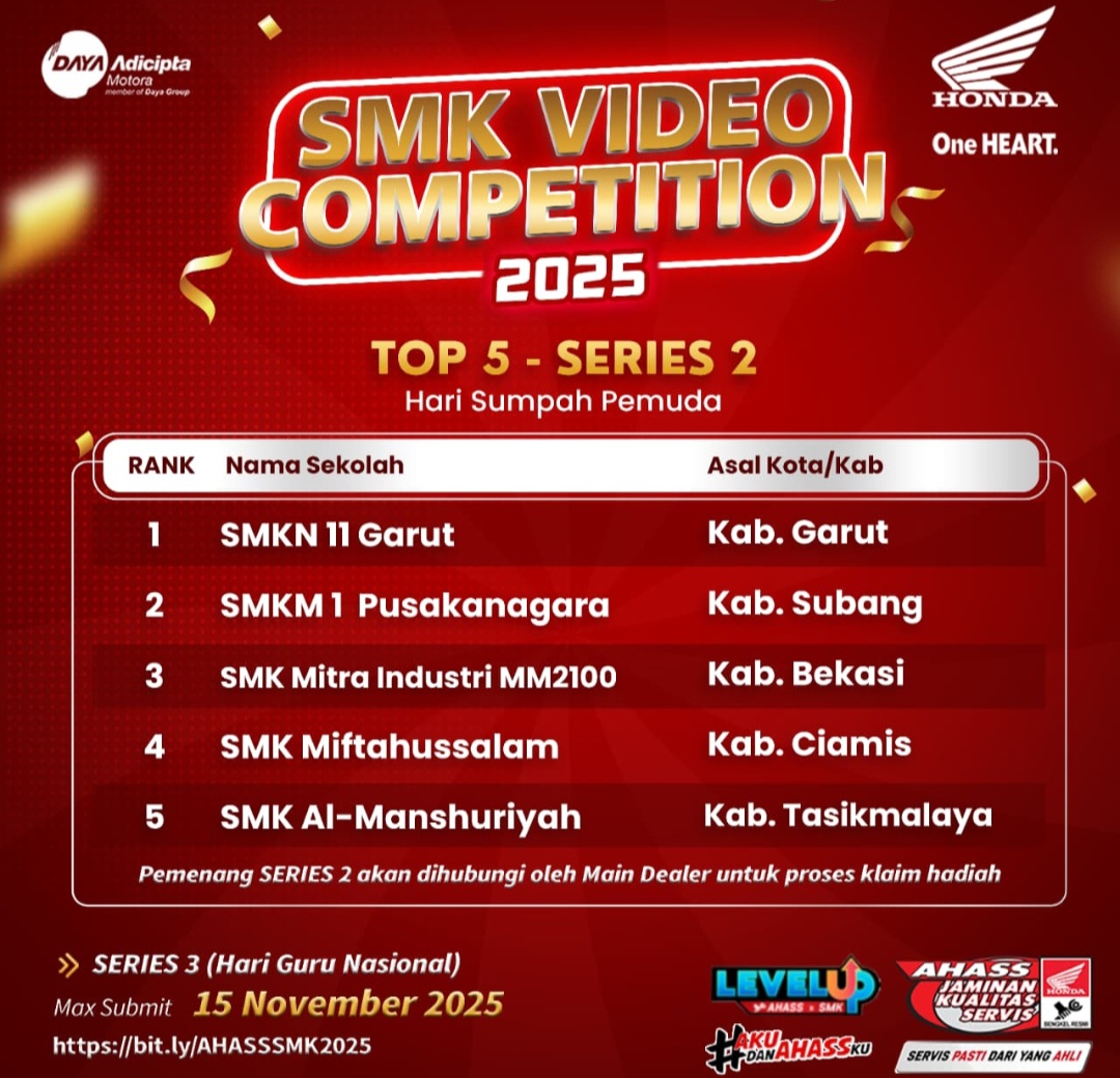 Kompetisi bergengsi ini diikuti oleh 135 SMK binaan Honda dari berbagai daerah di Jawa Barat. Dalam pengumuman resmi bertajuk “Top 5 – Series 2” yang mengusung tema Hari Sumpah Pemuda, karya video dari SMKN 11 Garut dinilai paling unggul dan berhasil menyisihkan ratusan pesaing lainnya.